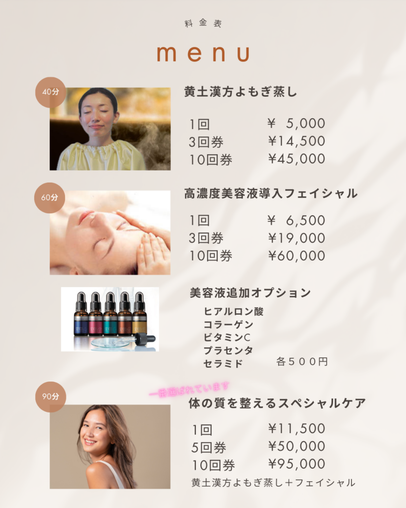 | 黄土漢方よもぎ蒸し(40分) | 5,000円 |